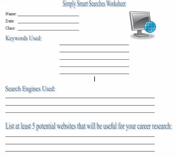 You're doing a great job! Now you are ready to begin researching your career. Take a look at the Simply Smart Searches worksheet (see example below):